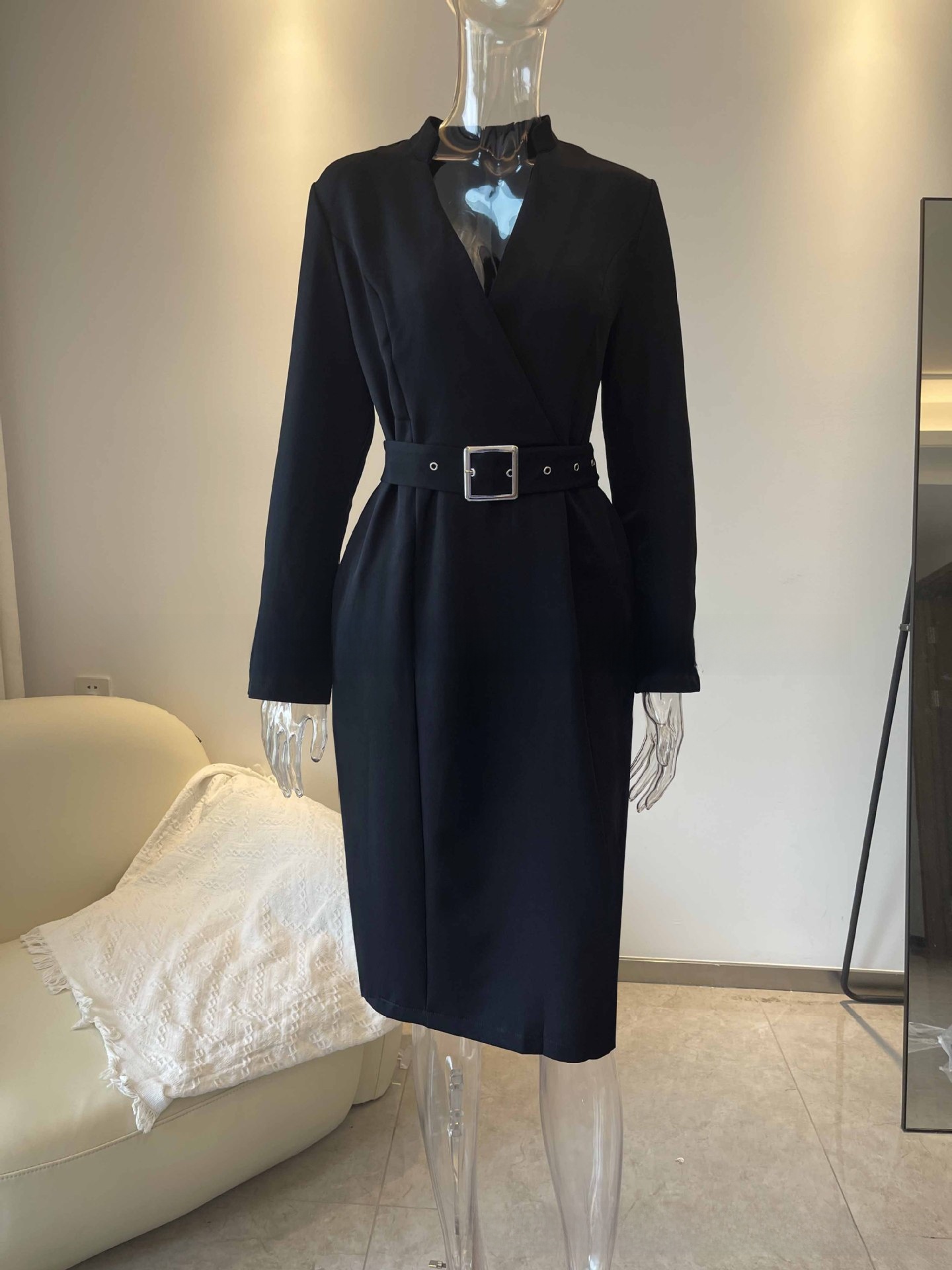 Elegant Design: A stylish long-sleeve dress with a waist belt, perfect for a graceful and refined look.