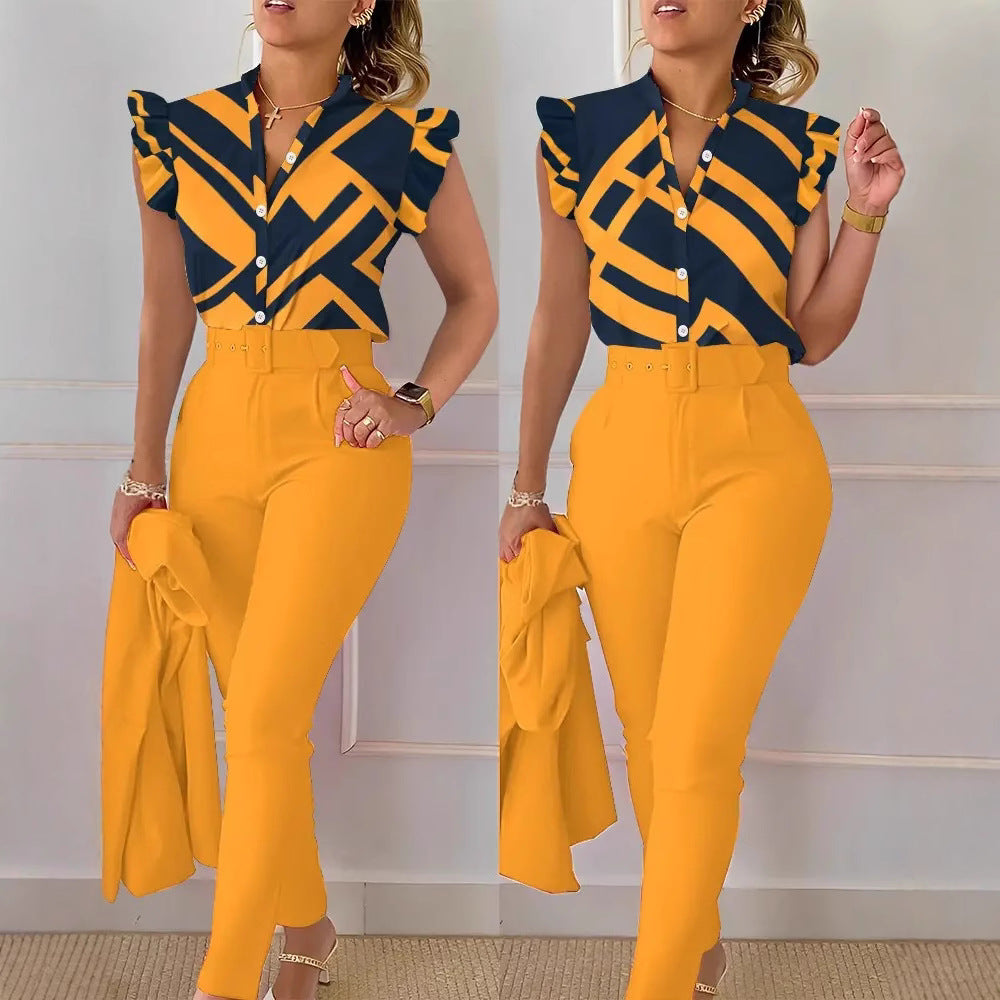 Fashion Printed Lotus Sleeve Top and Pants