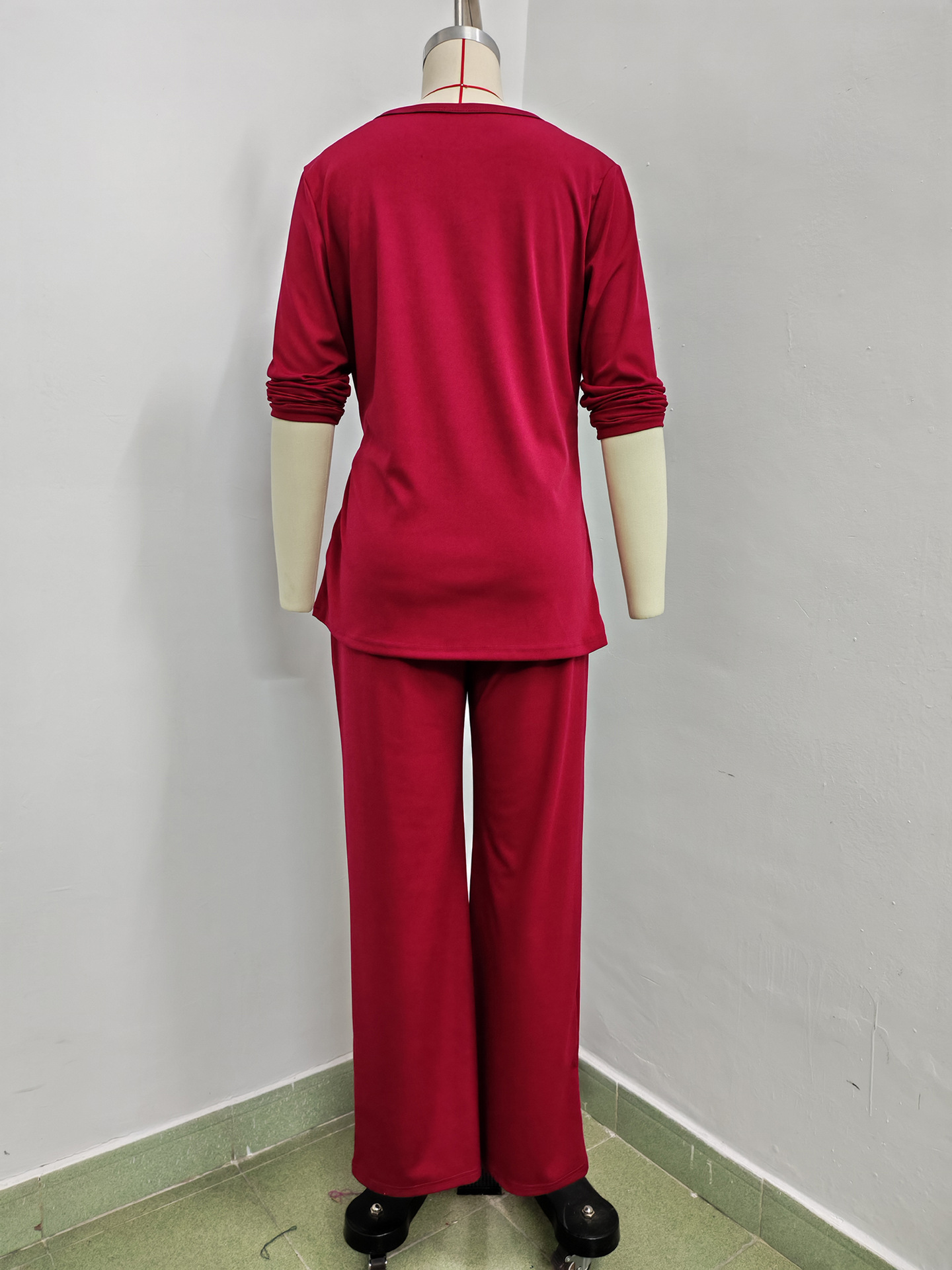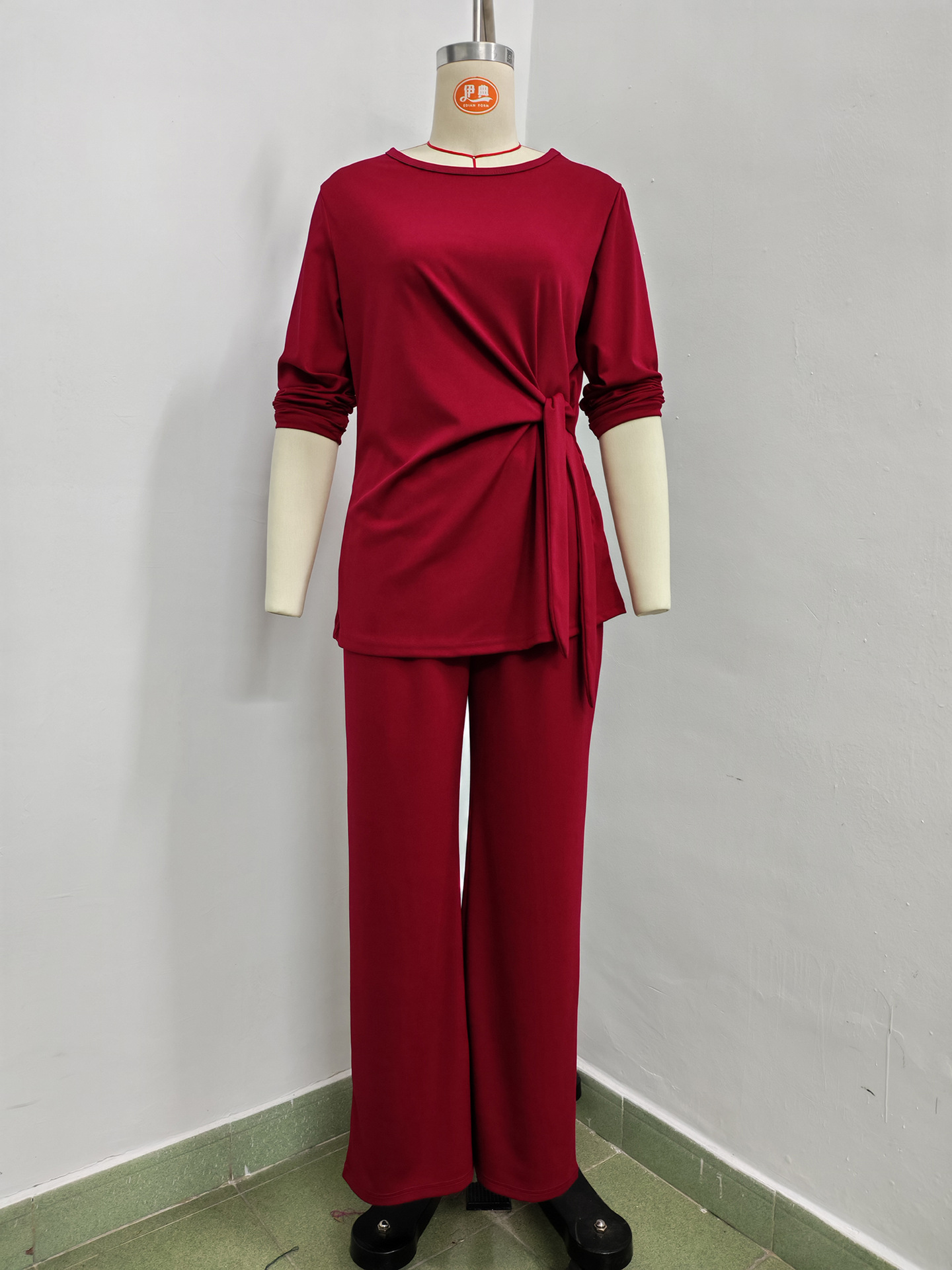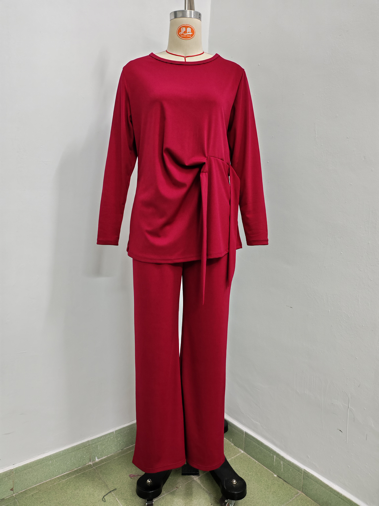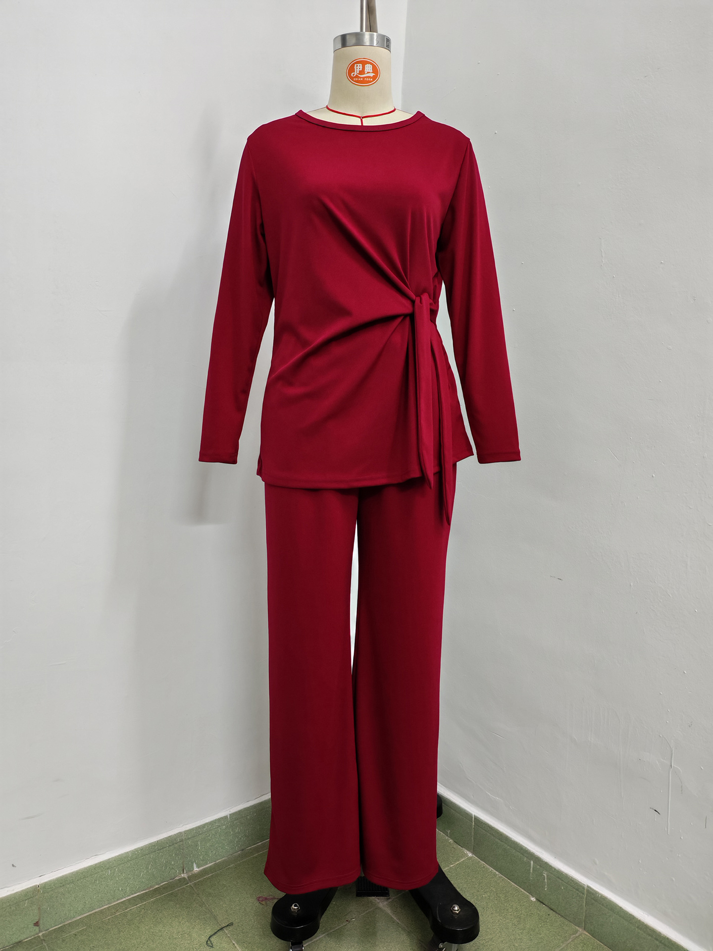 Stylish Design: Trendy three-piece set featuring a round neck top, long pants, and mid-length coat for a fashionable look.