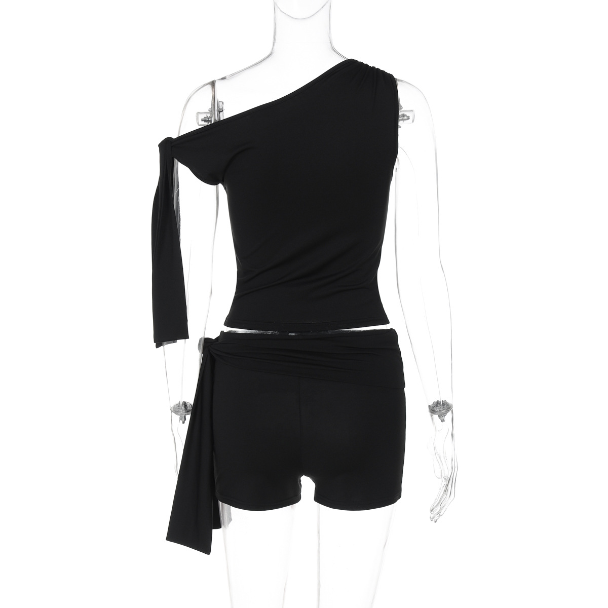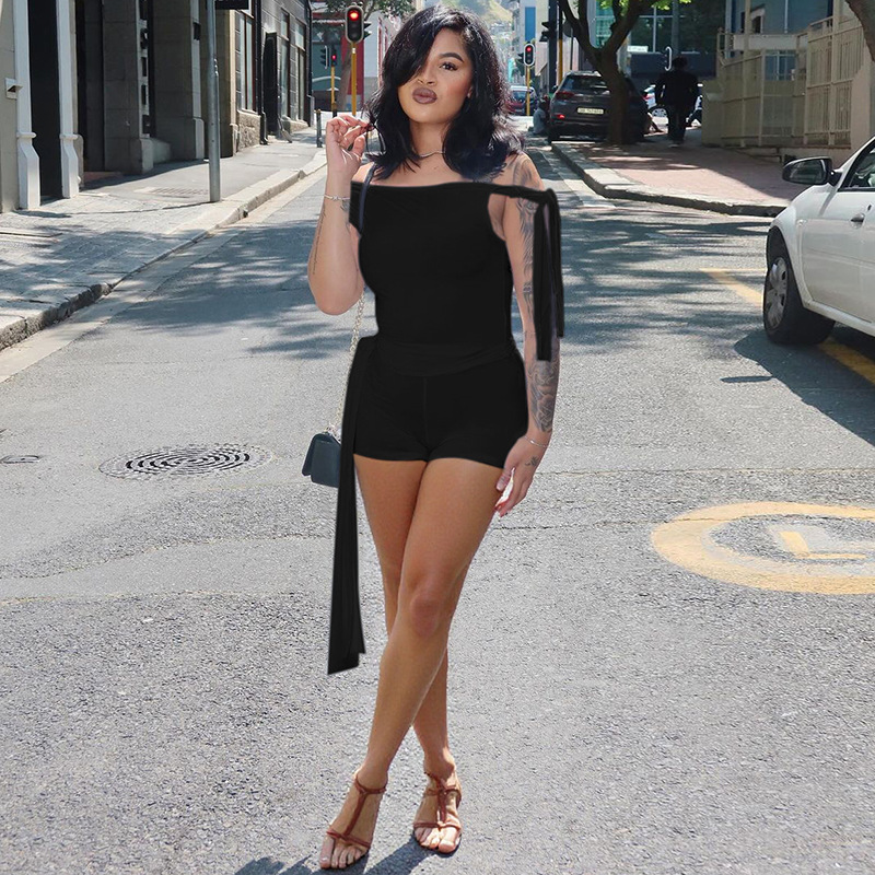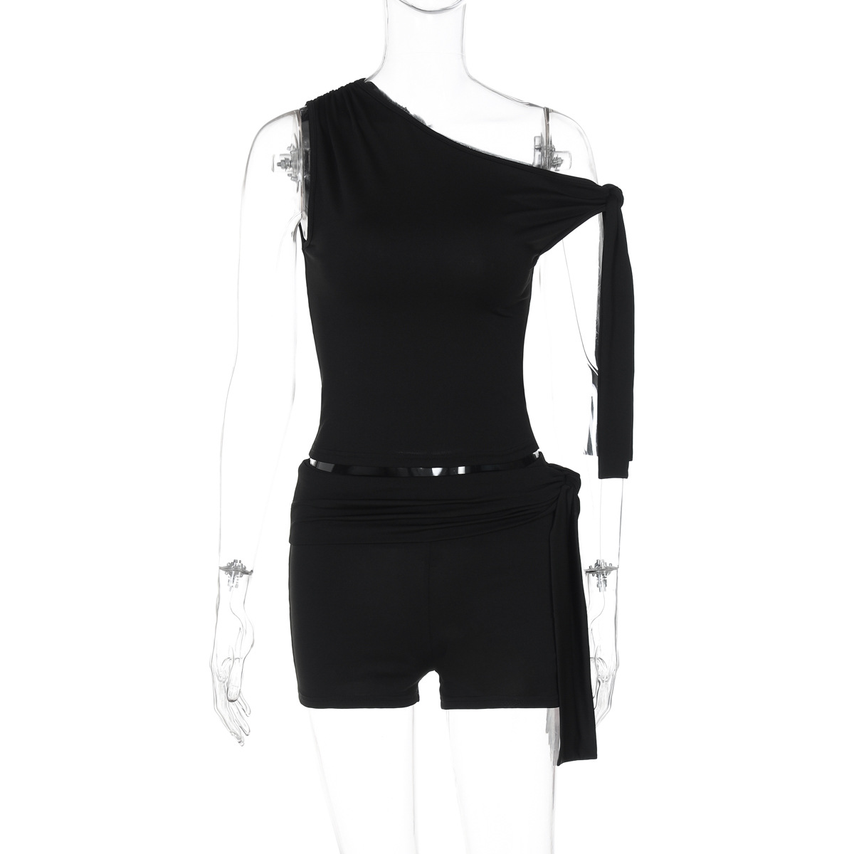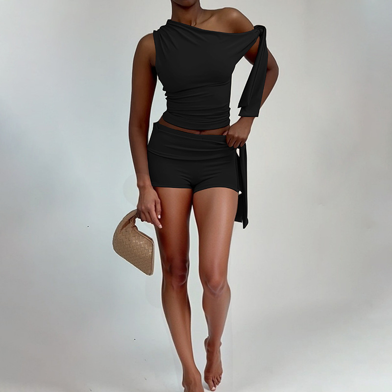 Fashionable Design: Slope collar sleeveless top with lace-up slim shorts for a trendy summer look.
